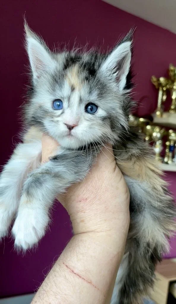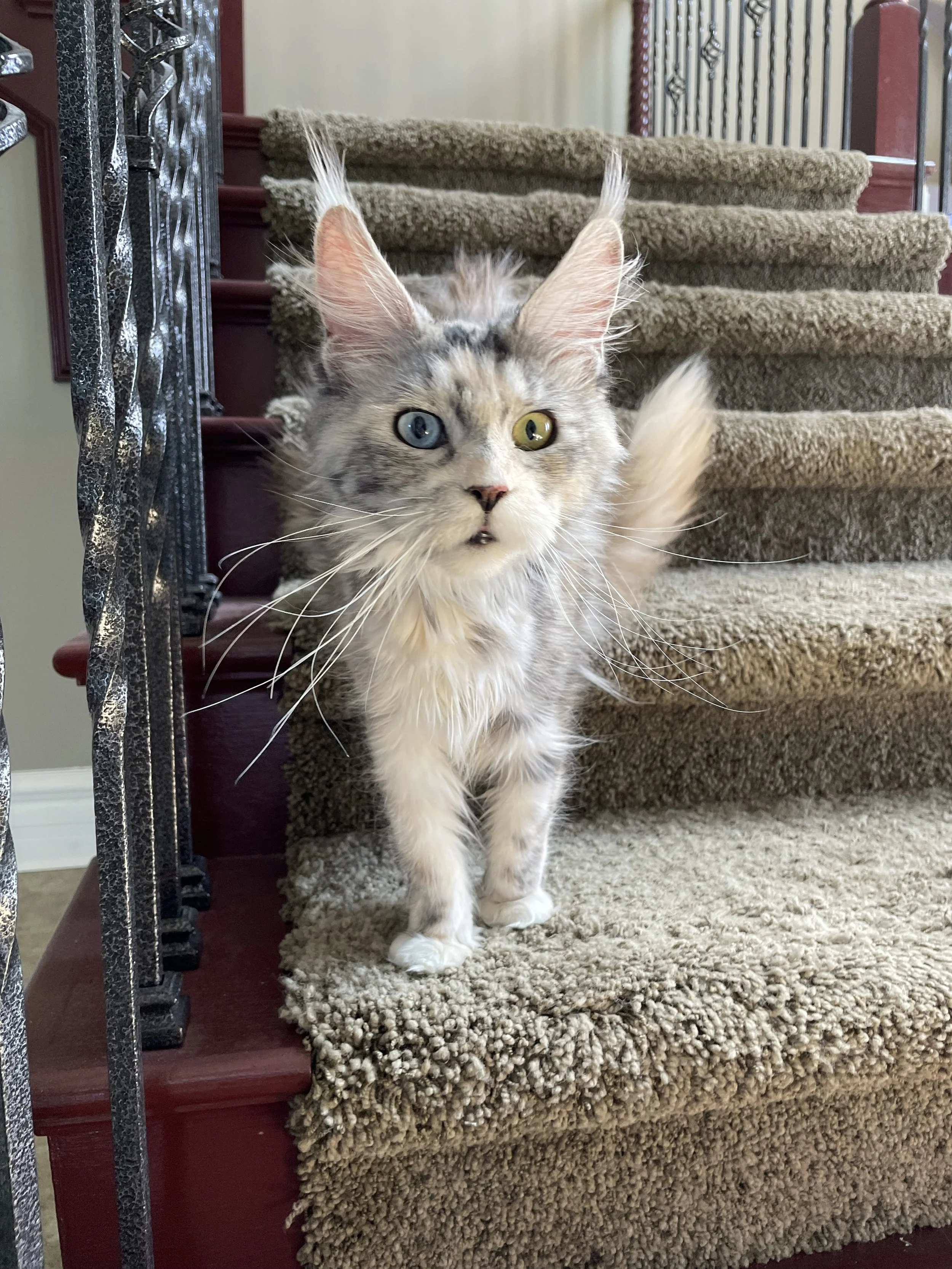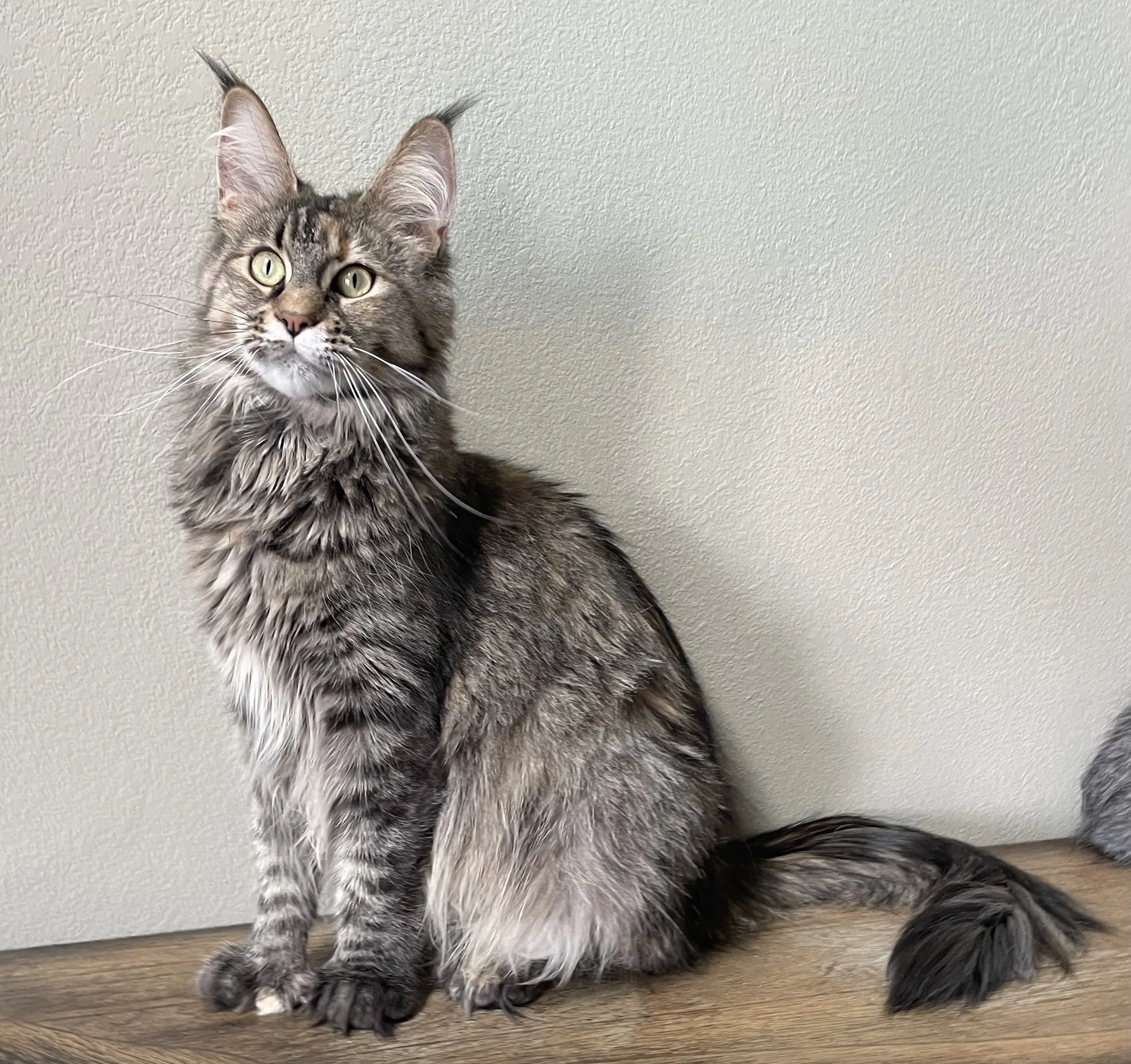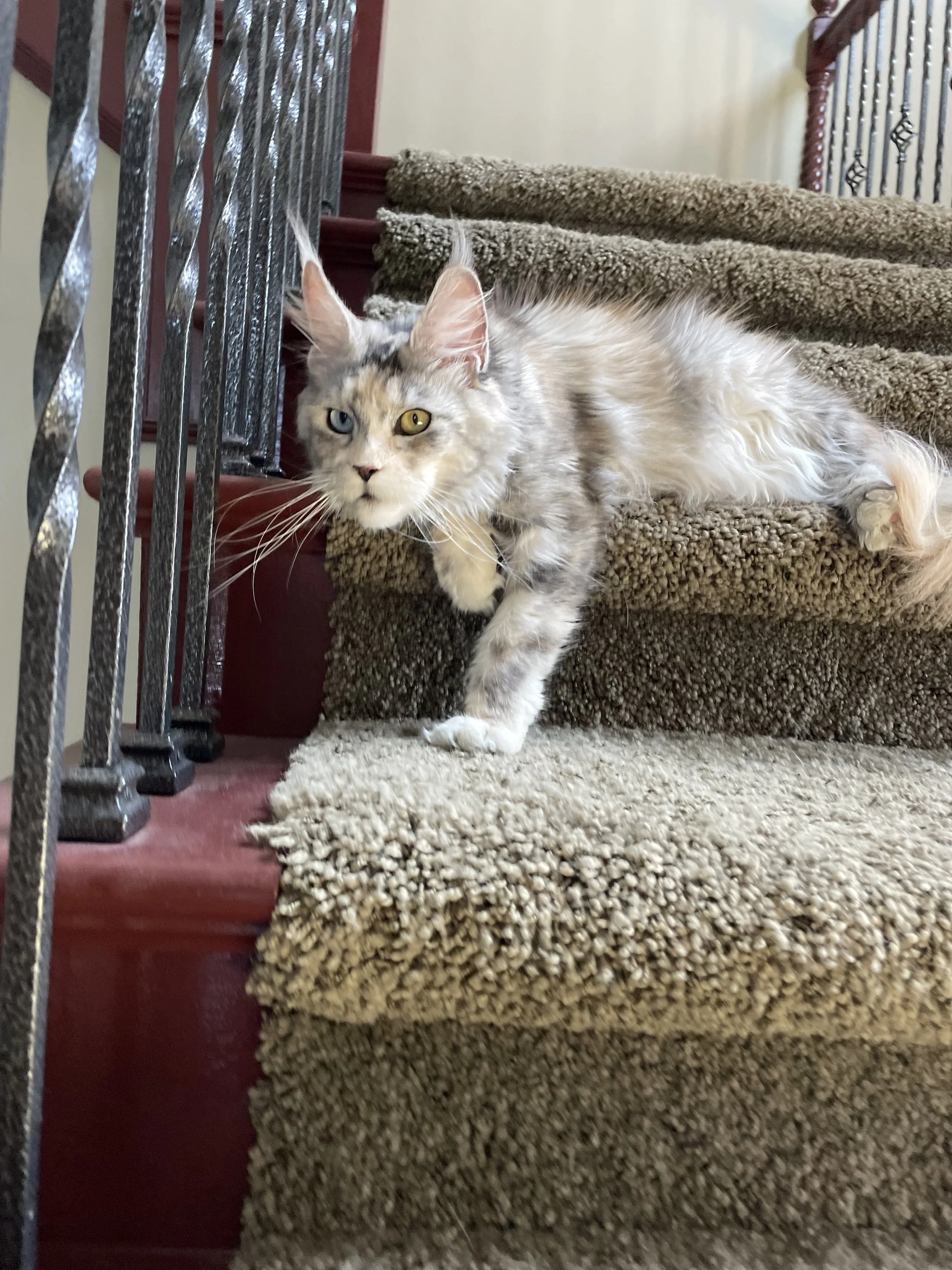Meet Reiynka, the majestic dilute tortoiseshell Maine Coon with captivating odd-colored eyes. Her fur is a stunning blend of soft grays and muted creams, creating a cloud-like effect that complements her regal presence. One glance into her mesmerizing eyes—each a different hue—reveals the depths of her spirited personality.