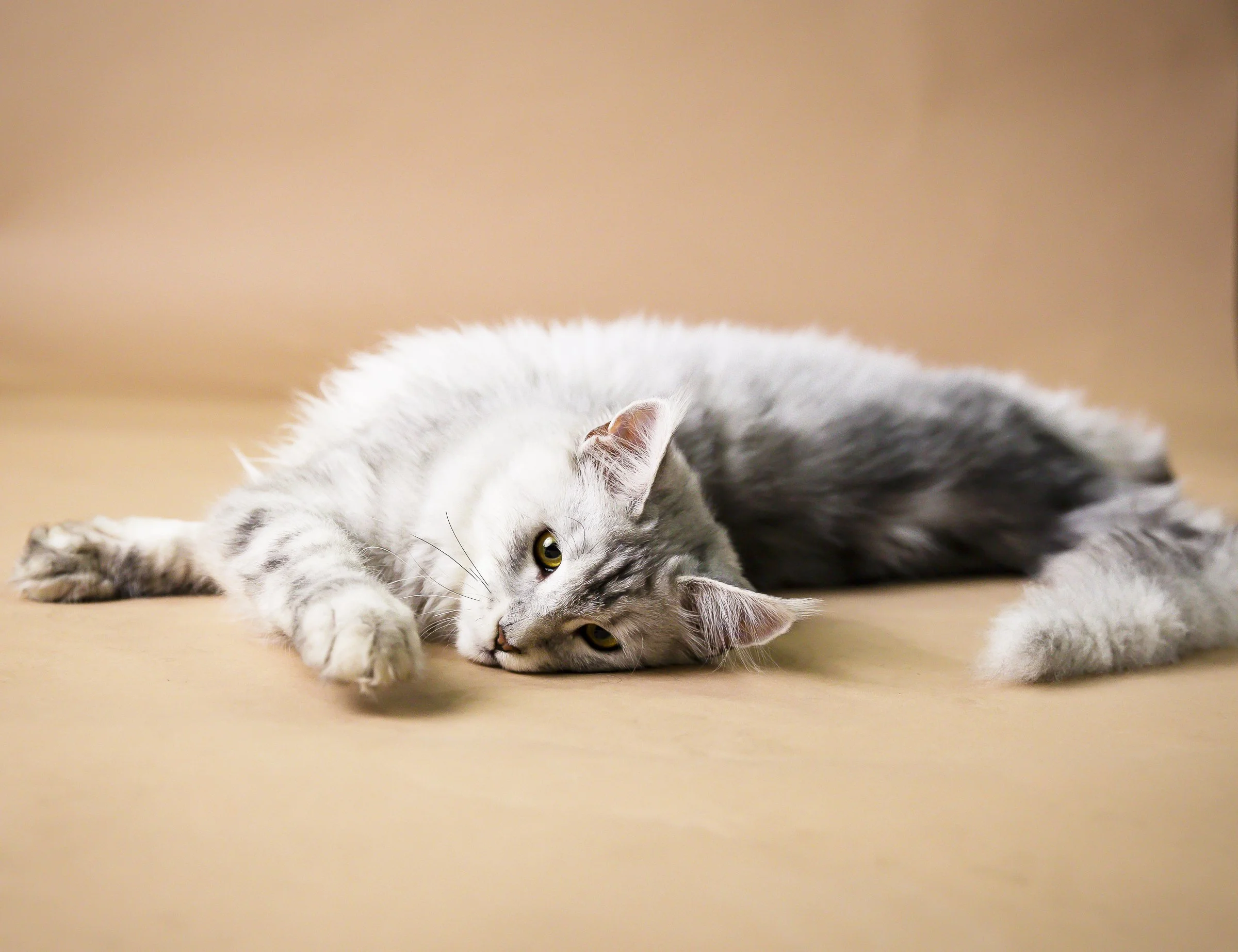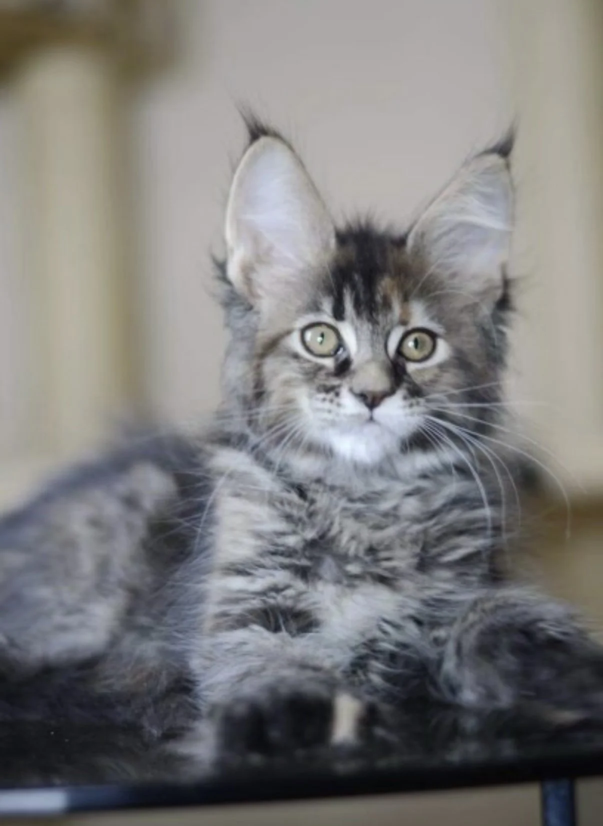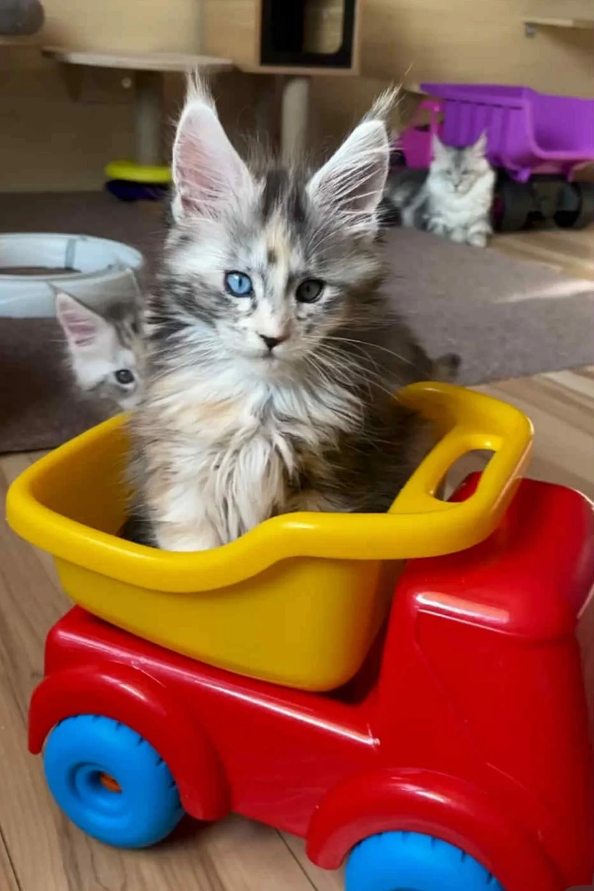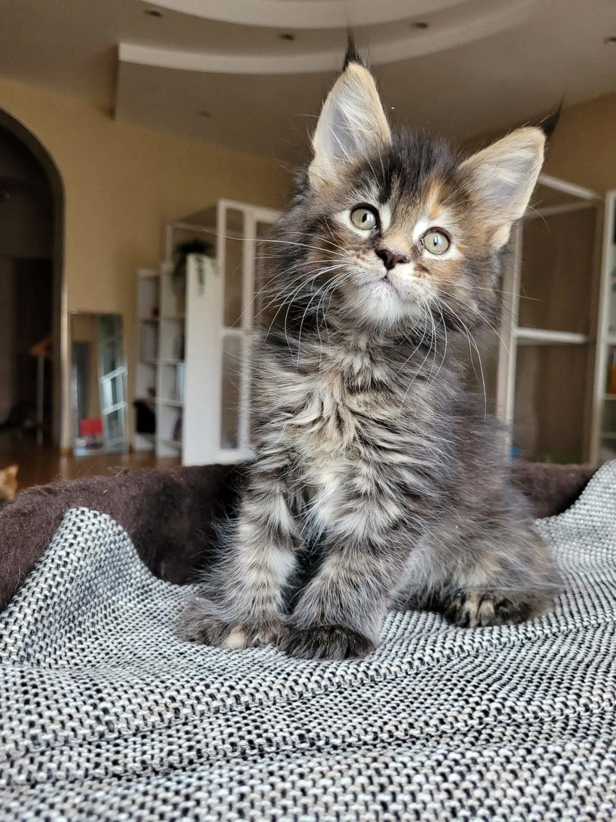 Meet Reiynka, the majestic dilute tortoiseshell Maine Coon with captivating odd-colored eyes. Her fur is a stunning blend of soft grays and muted creams, creating a cloud-like effect that complements her regal presence. One glance into her mesmerizing eyes—each a different hue—reveals the depths of her spirited personality.
