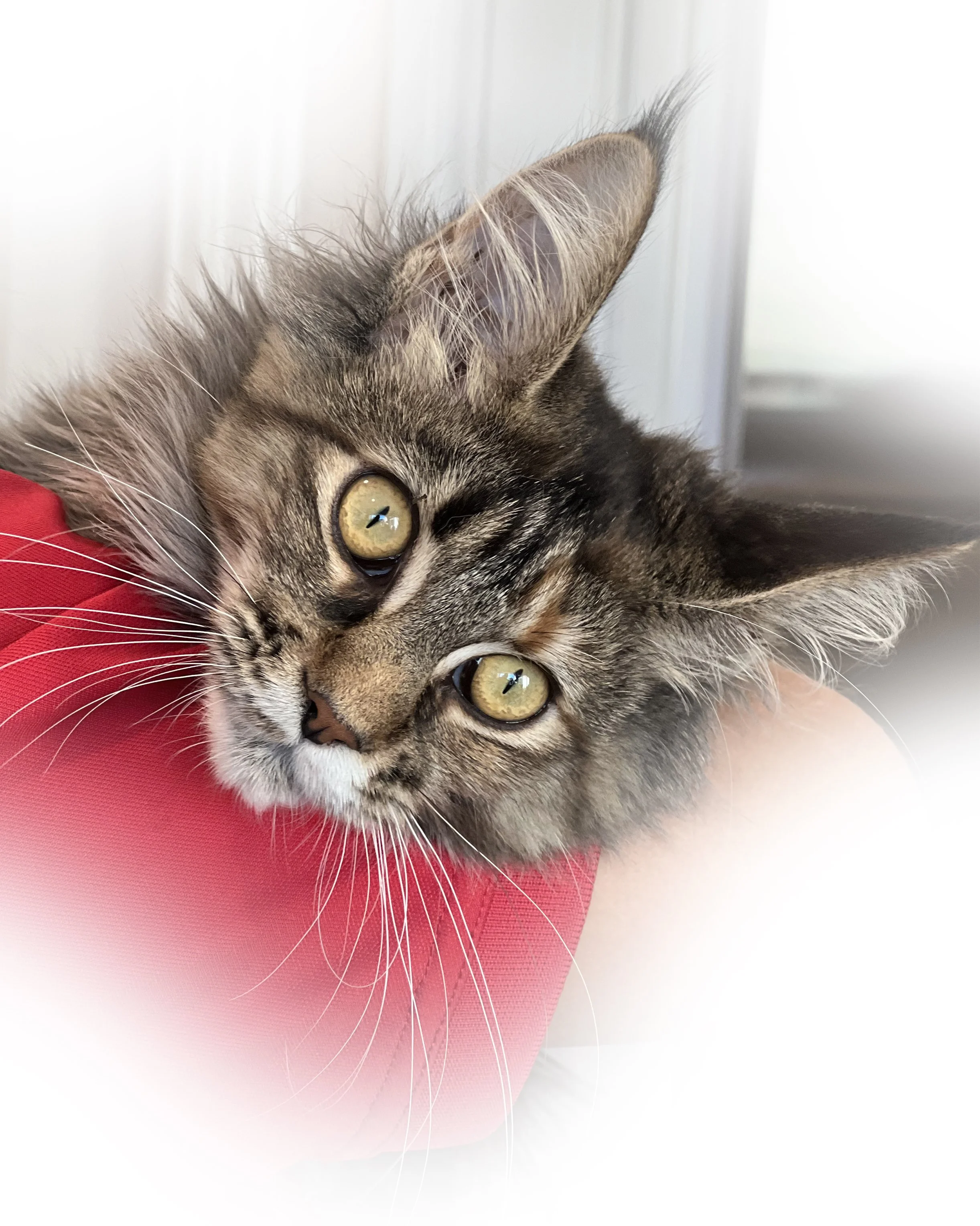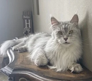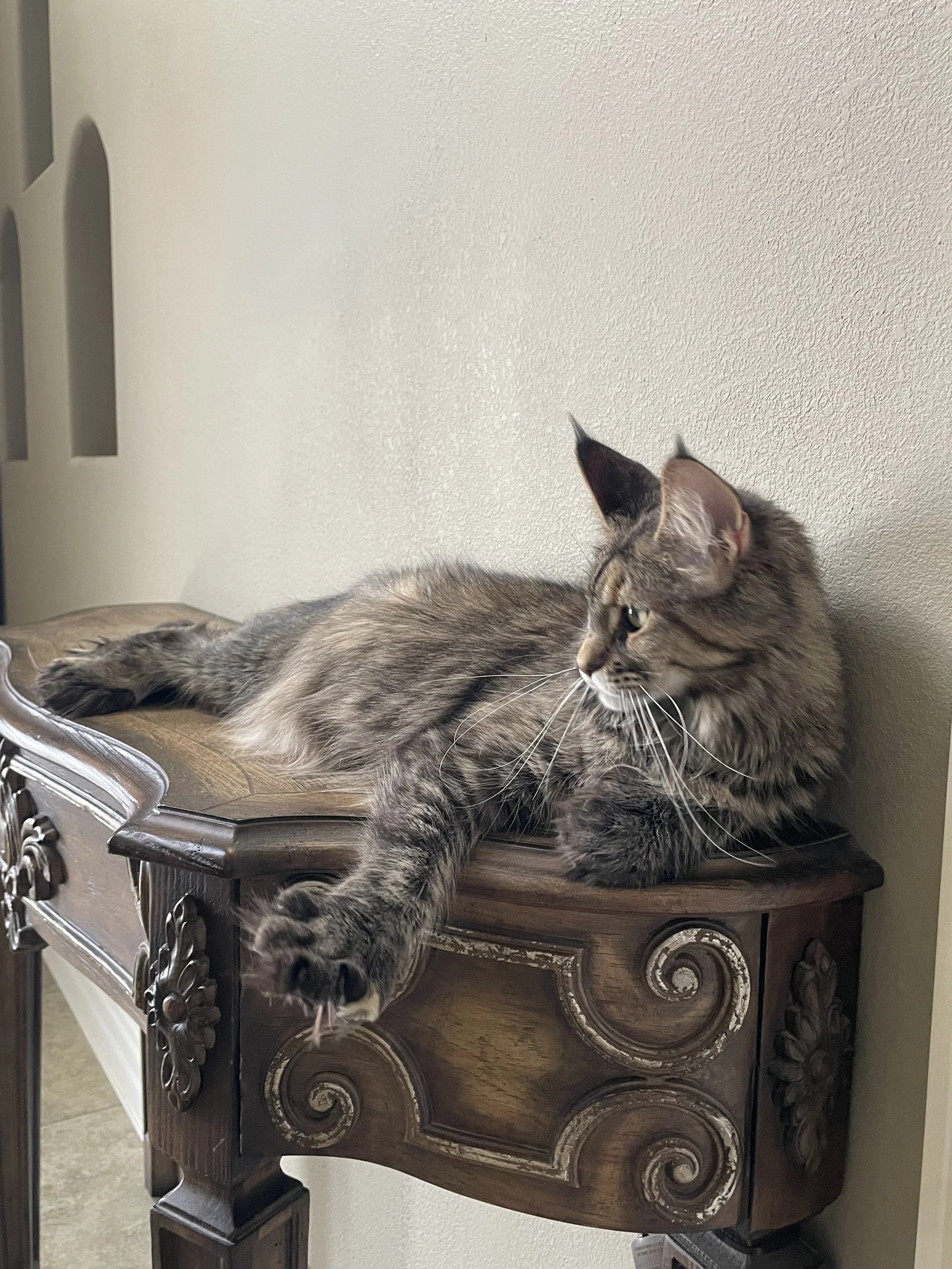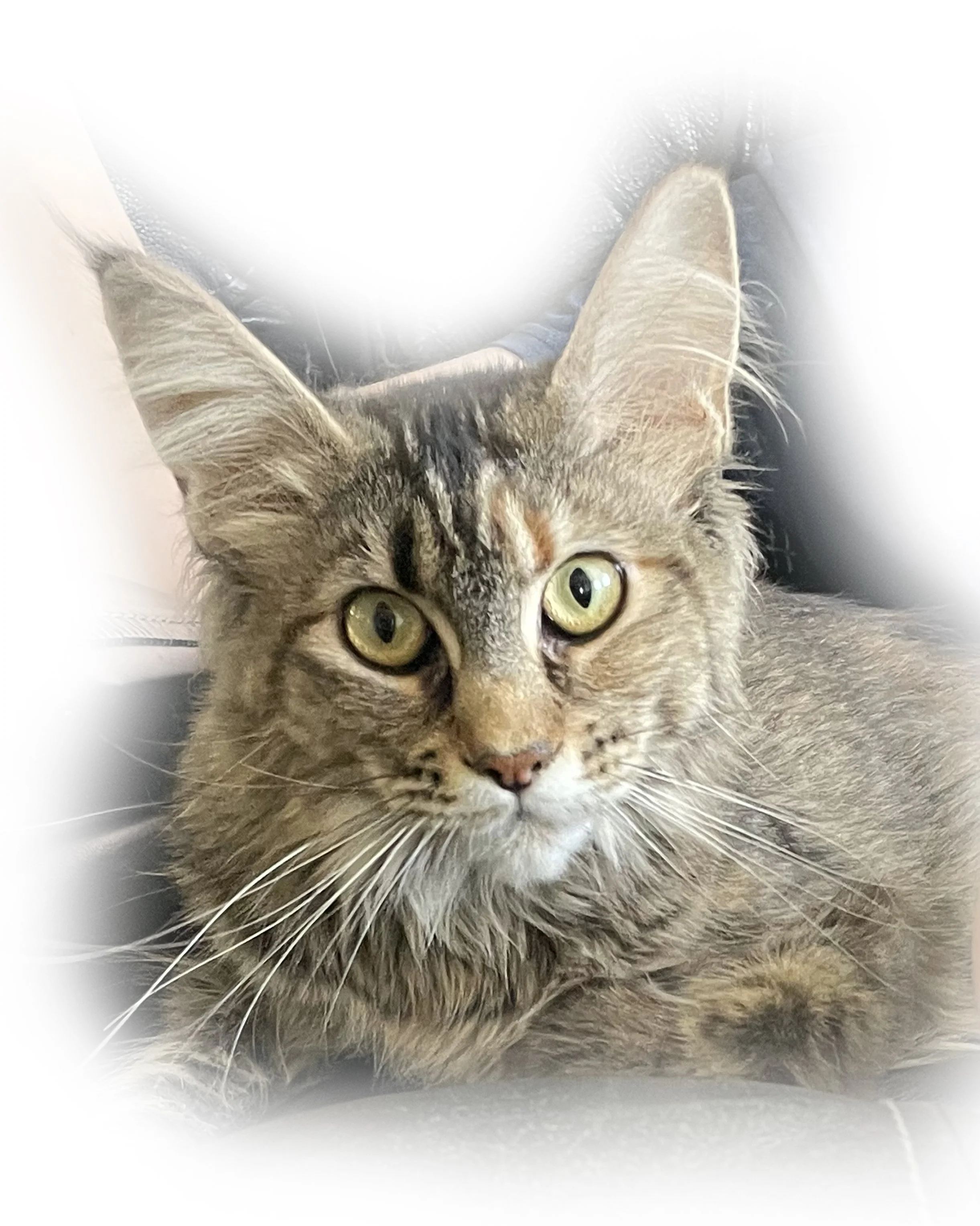 Her curiosity knows no bounds, as she explores every nook and cranny, her sharp gaze missing nothing. Fierce and independent, Poly Oly embodies the spirit of a true queen—confident, bold, and unapologetically herself. Whether perched high, surveying her domain, or stealthily stalking an imaginary prey, Poly Oly is a captivating blend of strength and elegance, a true testament to the Maine Coon’s majestic lineage.