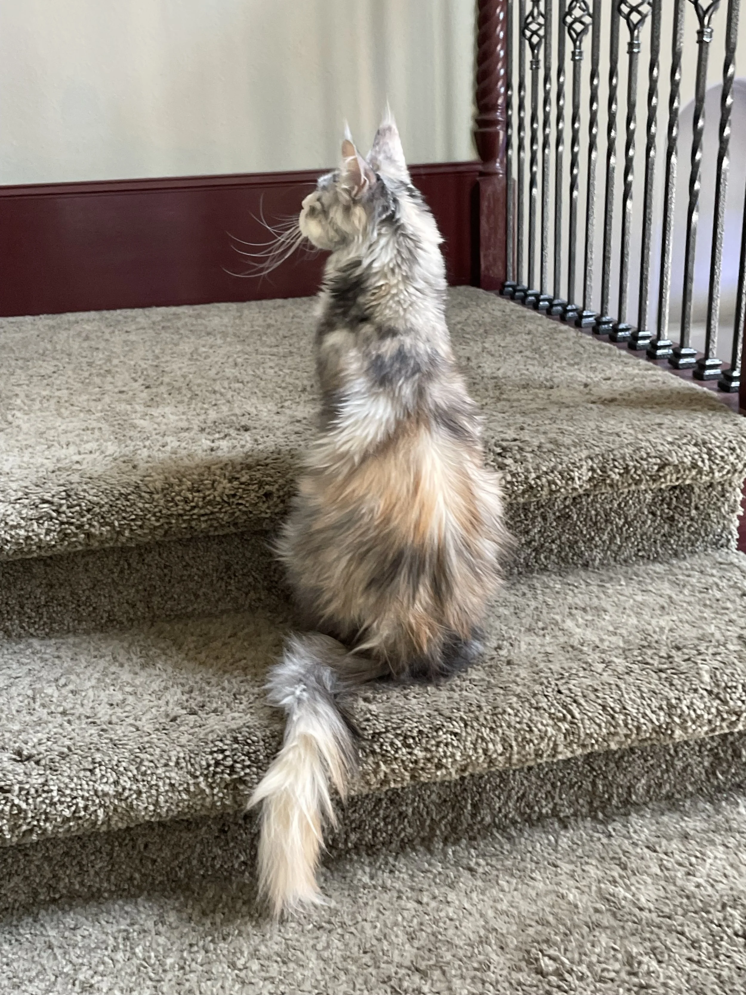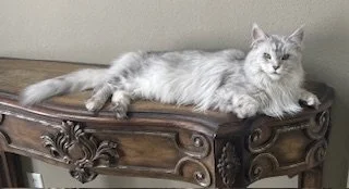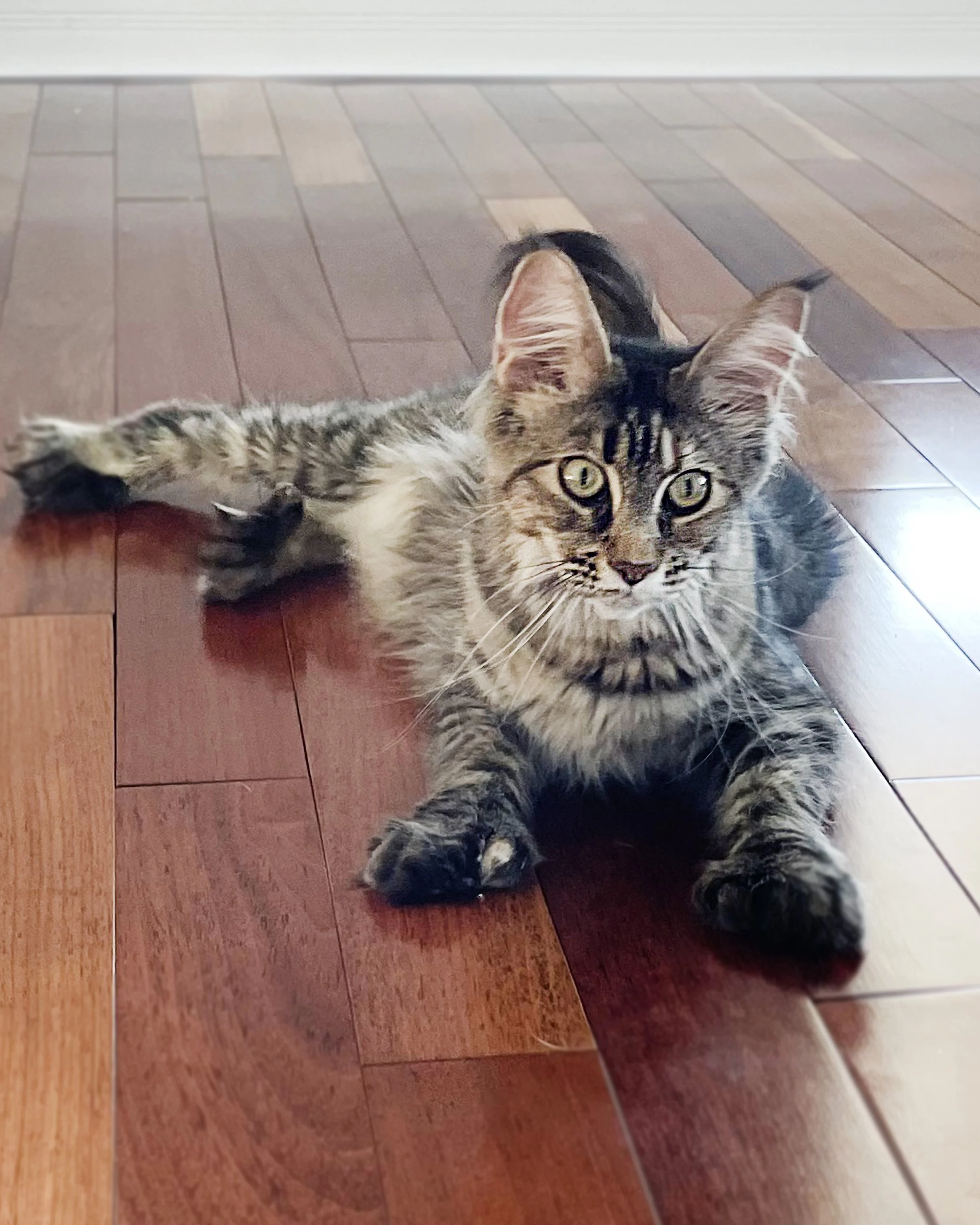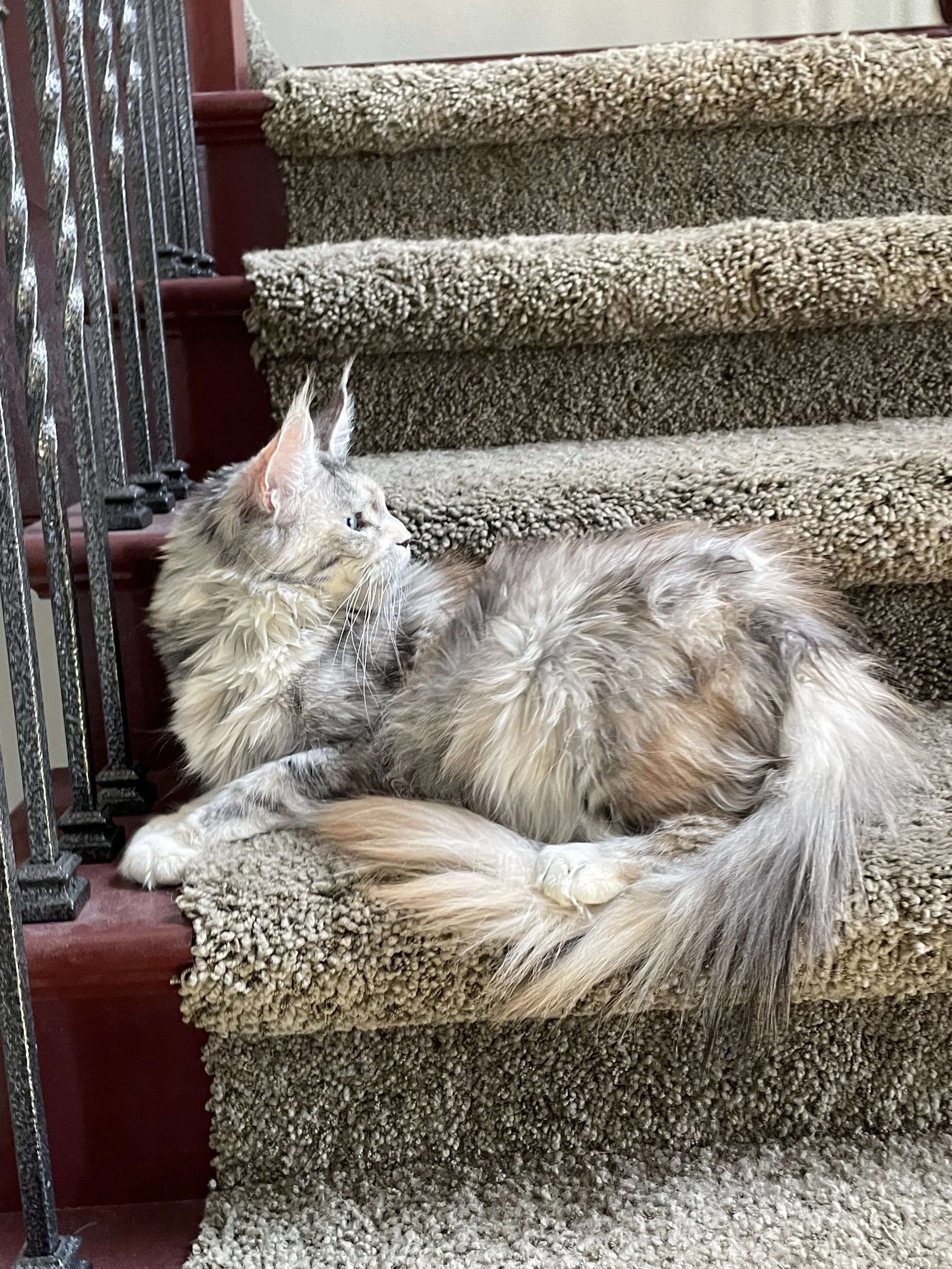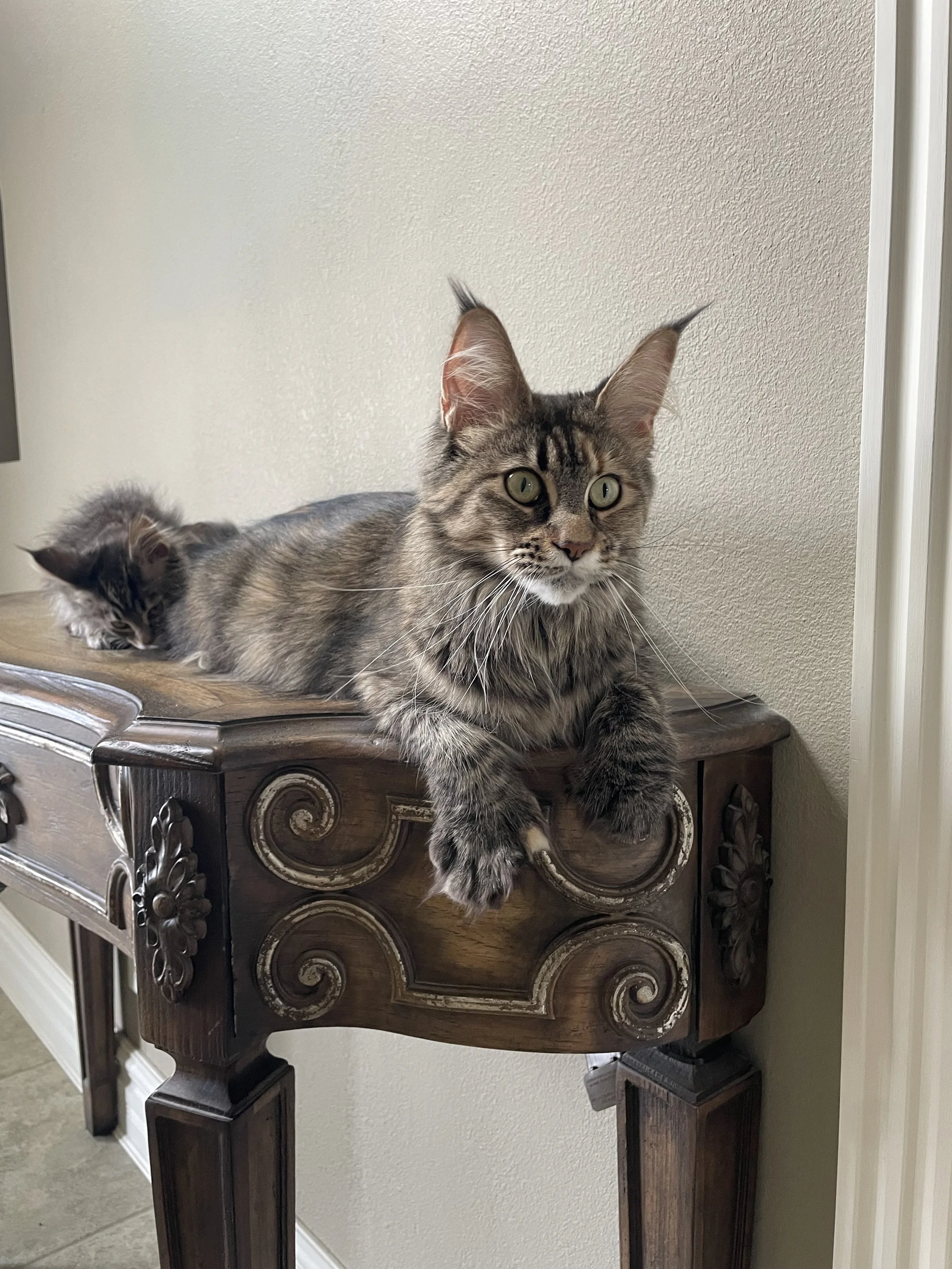 Her curiosity knows no bounds, as she explores every nook and cranny, her sharp gaze missing nothing. Fierce and independent, Poly Oly embodies the spirit of a true queen—confident, bold, and unapologetically herself. Whether perched high, surveying her domain, or stealthily stalking an imaginary prey, Poly Oly is a captivating blend of strength and elegance, a true testament to the Maine Coon’s majestic lineage.